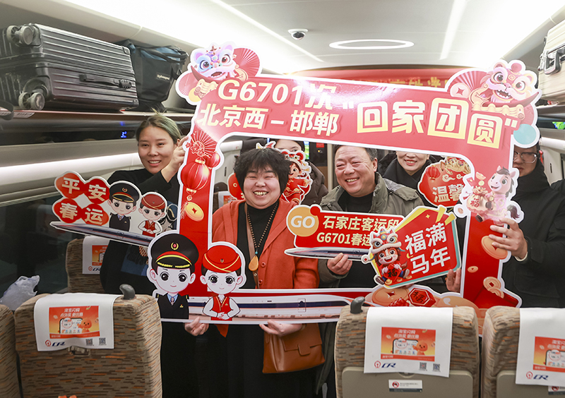 ▲2月2日5点34分,北京地区春运首趟始发高铁列车G6701次从北京西站准点启程,驶向邯郸东站。图为旅客在车厢内拍照。中新社