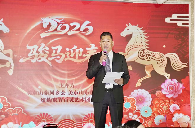【侨报纽约讯】新春佳节来临之际,美东山东同乡会和美东山东总商会于2月1日晚在法拉盛隆重举办2026年春节联欢晚会,近500名山东籍乡亲及各界嘉宾欢聚一堂。国会议员孟昭文、中国驻纽约总领馆领侨处主任潘焱、福建同乡会主席陈恒、香港工商总会会长陈善庄等人士也应邀出席致贺。