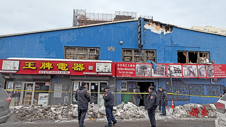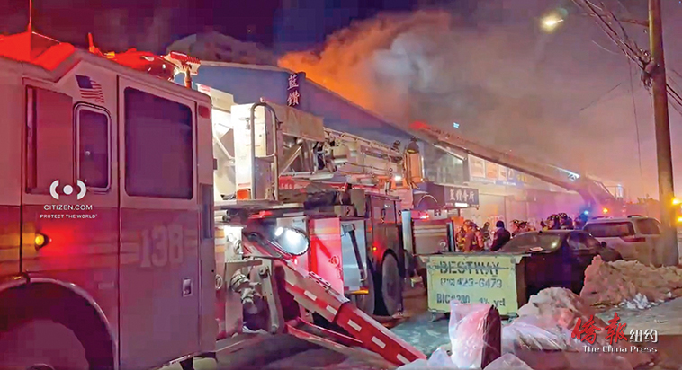 【侨报特约记者金玉贻纽约报道】位于法拉盛41大道131-37号的一栋两层商业建筑3日凌晨发生大火,一时间火光冲天,附近居民在睡梦中被惊醒,有隔壁商家业主冒着严寒到现场查看情况。消防局派出大量消防车及消防人员赶赴现场,最终将大火扑灭,所幸无人伤亡,但建筑受损严重。消防局表示,起火原因仍在调查。