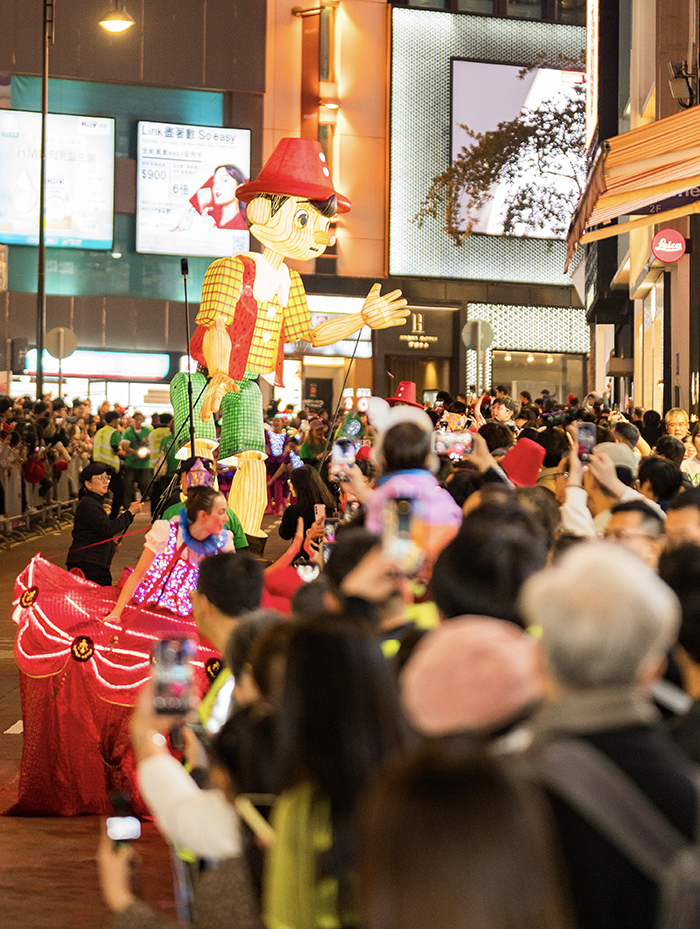 ▲2月7日晚,以《木偶奇遇记》为主题的“渣打艺趣嘉年华”的“夜光巡游”环节在香港铜锣湾利园一带上演,“匹诺曹”等5个大型灯笼木偶“走”上街头与沿途观众互动,为中国农历新年前夕的周末增添趣味。图为“匹诺曹”木偶与沿途市民、游客互动。中新社