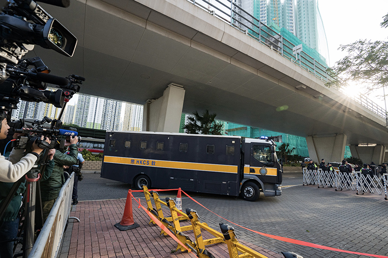 ▲2月9日上午,黎智英案在香港西九龙裁判法院宣布判刑,图为押送黎智英的惩教署车辆驶入西九龙裁判法院。中新社