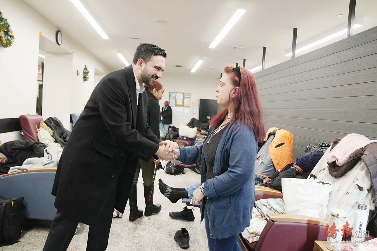 【侨报记者管黎明2月8日纽约报道】周日在危险低温持续的情况下,市长曼达尼前往曼哈顿一处市府取暖中心视察,与无家可归者交流,同时也向在此期间工作的市政工作人员、非营利机构合作伙伴及志愿者表达感谢。