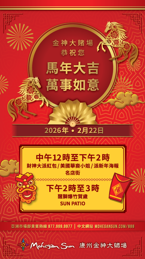 更多活动具体详情请浏览金神中文网站mohegansun.com/888,小红书关注@康州金神MoheganSun,微博关注@mohegansun金神,或致电亚洲市场部贵宾免费热线 :1.877.999.9977。