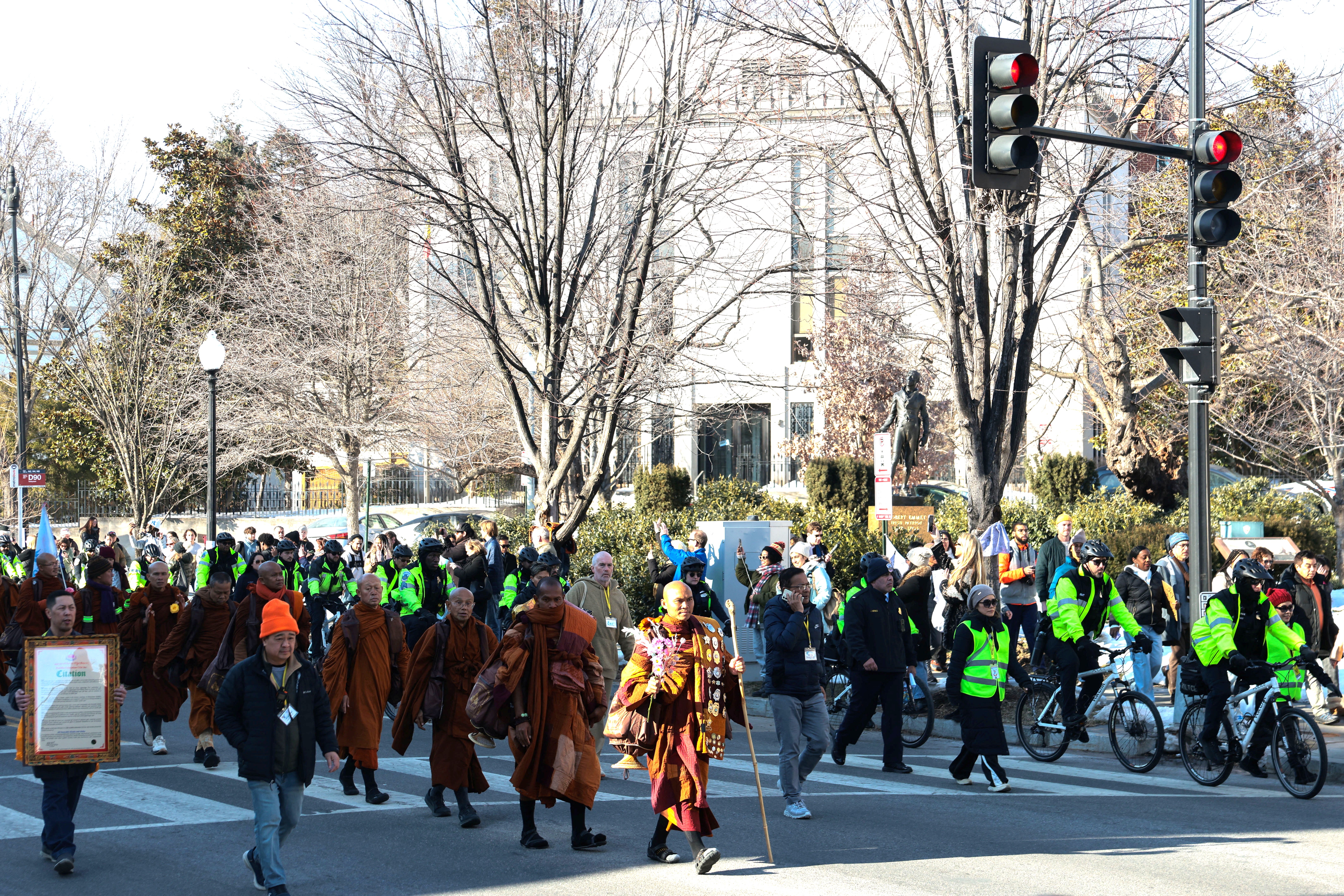 美国僧侣团徒步2300英里呼唤社会和平 华盛顿民众迎接