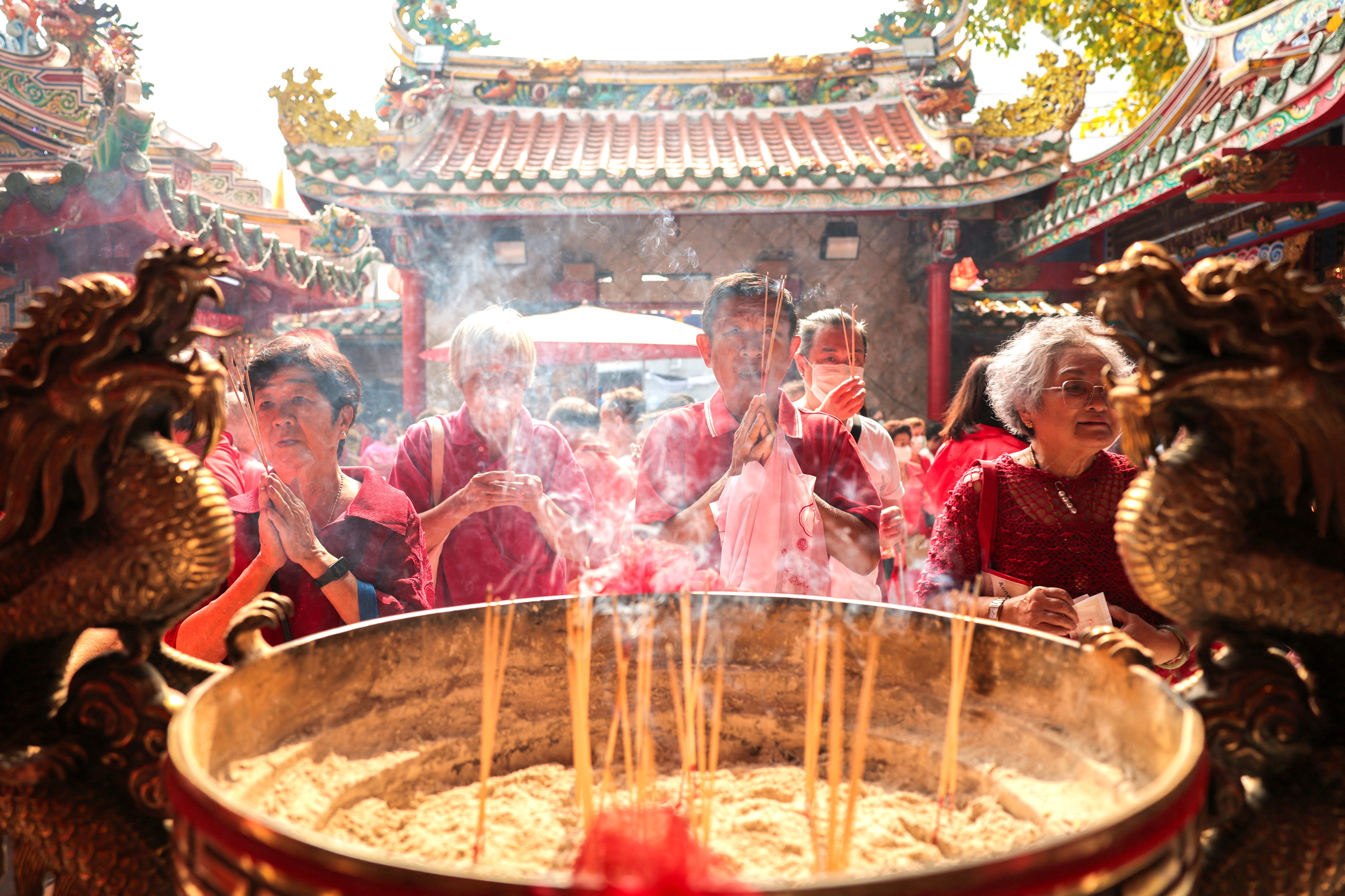 在香港,午夜时分多座庙宇香烟缭绕,信众排队入庙许愿,手持多支香烛反复叩首后插入香炉。台湾台北保安宫清晨鸣钟108下,象征祈福与吉祥,信众携带花束与供品前来参拜。