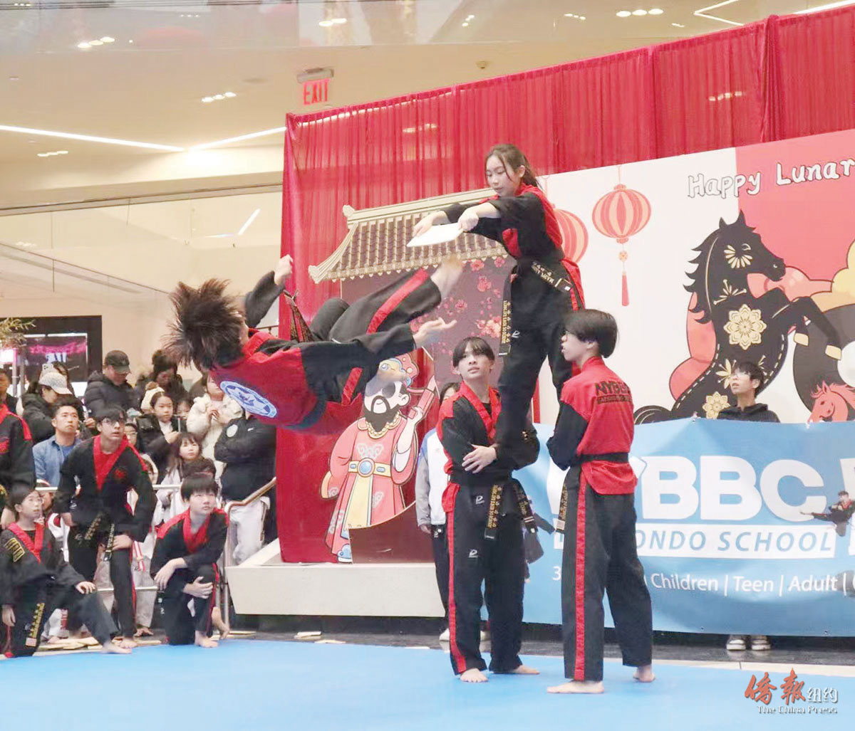 15日法拉盛举办农历新年庆祝活动,新苗文艺中心舞狮表演。 (黄敏仪办公室提供)