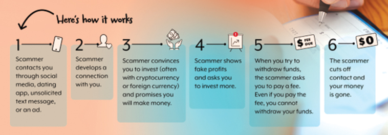 受害者若中招参与“投资”,通常会在骗子引导下,从所谓的投资平台上看到账户余额不断增长。受害者因此更加信任对方,投入更多资金,但等到想要提现时却发现无法提现,或被要求预先支付“手续费”或“税款”。最终,骗匪会切断联系,卷款消失。