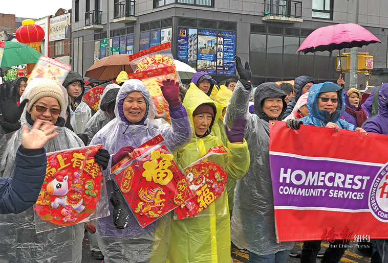 【侨报记者高诗云2月22日纽约报道】布碌仑华人社区服务中心(CASS)携手州众议员寇顿和市议员庄文怡办公室,于22日(周日)大年初六在宾臣墟区举行马年新春大游行。尽管当天上午细雨纷飞,又逢暴雪前夕,各族民众依然热情参与,以华人团体为主的数十家机构热热闹闹走过十八大道,再一次为当地商圈带来浓厚的新春气氛。
