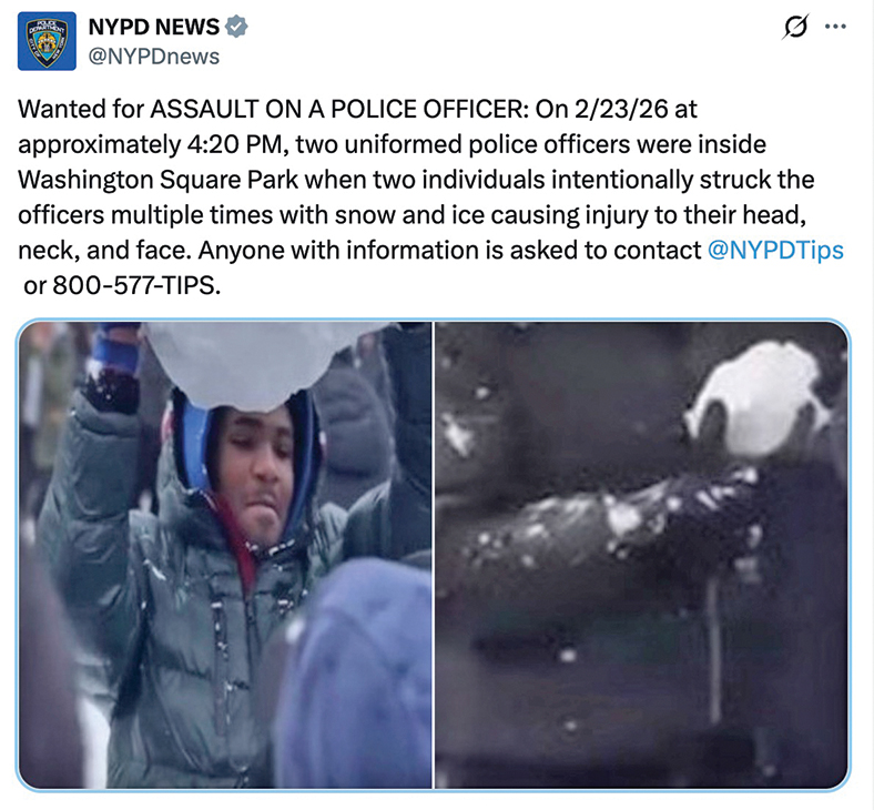 【侨报纽约讯】一场原本被宣传为“雪球大战”的活动周一下午在纽约大学附近的华盛顿广场举行,但活动随着多名警员前去维持秩序而变味 —— 警员们遭到游戏者投掷雪球,其中两人受伤就医。事后多方谴责袭击警察的行为,但市长曼达尼在查看录像后认为,这更像是一场雪球大战,不认为相关人员应面临刑事指控。这一立场令他与警察工会和许多支持警察的人士陷入关系紧张。