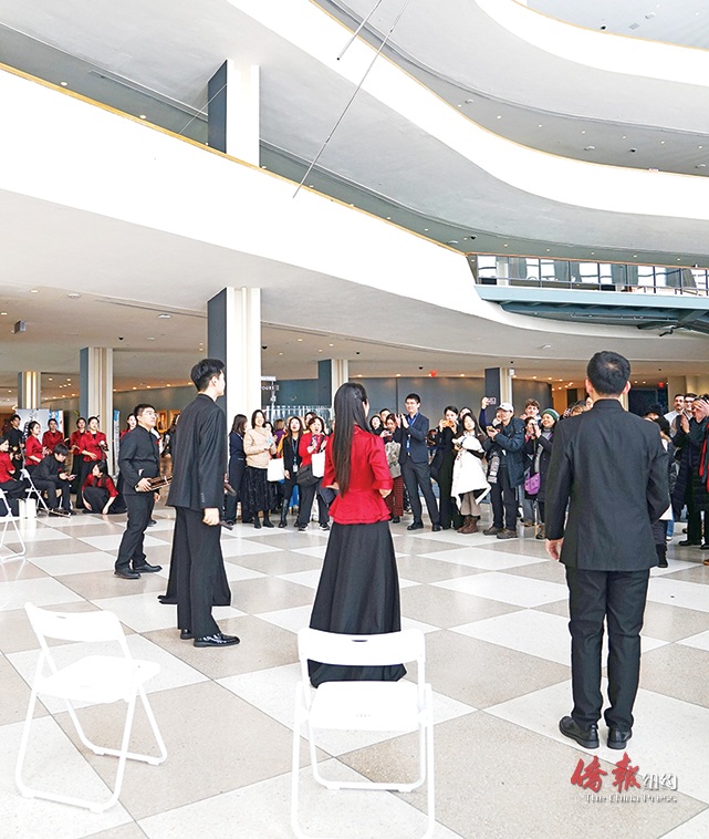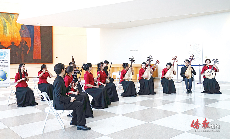 【侨报纽约讯】来自中央音乐学院的荣获金钟奖的“金钟之星”艺术团25日访问联合国纽约总部,由联合国妇女协会牵头组织,在联合国访客大厅带来了一场慈善快闪演出,吸引众多联合国国际职员、外交官和游客们驻足欣赏。