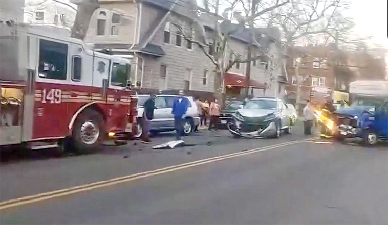 根据警方的消息,这宗连环车祸发生10日傍晚6点35分许,当时一辆纽约市消防局的消防车鸣着警笛、闪着灯,在布碌仑克利申地区沿着S大道向东行驶,在路口撞上了一辆沿着西11街向西行驶的白色商用货车。