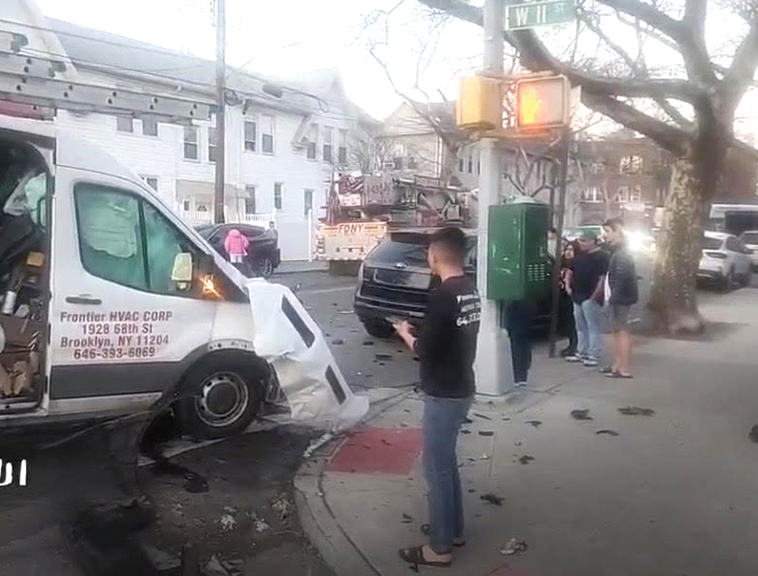 Citizen的目击者视频显示,祸发后,被撞的白色商用货车上下来一名华裔男子,该车的安全气囊都爆了出来,各种零件和碎片散落了一地。而车身上的信息显示这是一家从事暖通空调公司的车辆,地址就在宾臣墟区68街交19大道附近。