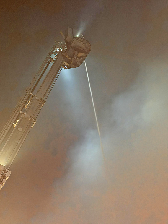 消防员在滚滚浓烟中喷水灭火。(来自消防局)
