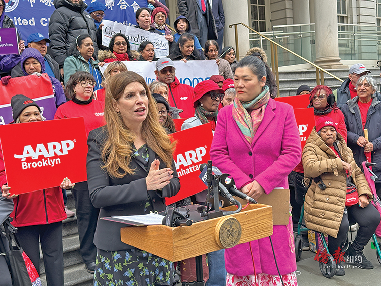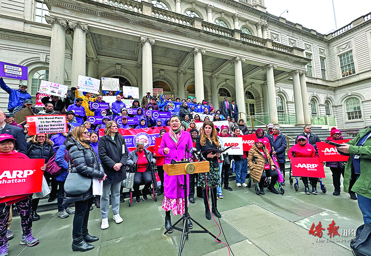 【侨报记者韩清湲3月12日纽约报道】在市议会初步预算听证会召开前,市议员庄文怡(Susan Zhuang)联合市议长朱曼宁(Julie Menin)以及多个长者权益组织12日于市政厅前举行集会,呼吁增加长者福利拨款。