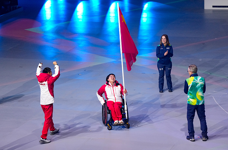▲当地时间3月15日,2026年米兰-科尔蒂纳冬残奥会闭幕式在意大利科尔蒂纳丹佩佐举行。中国体育代表团旗手蔡佳云(左一)和王蒙(左二)在闭幕式上入场。新华社