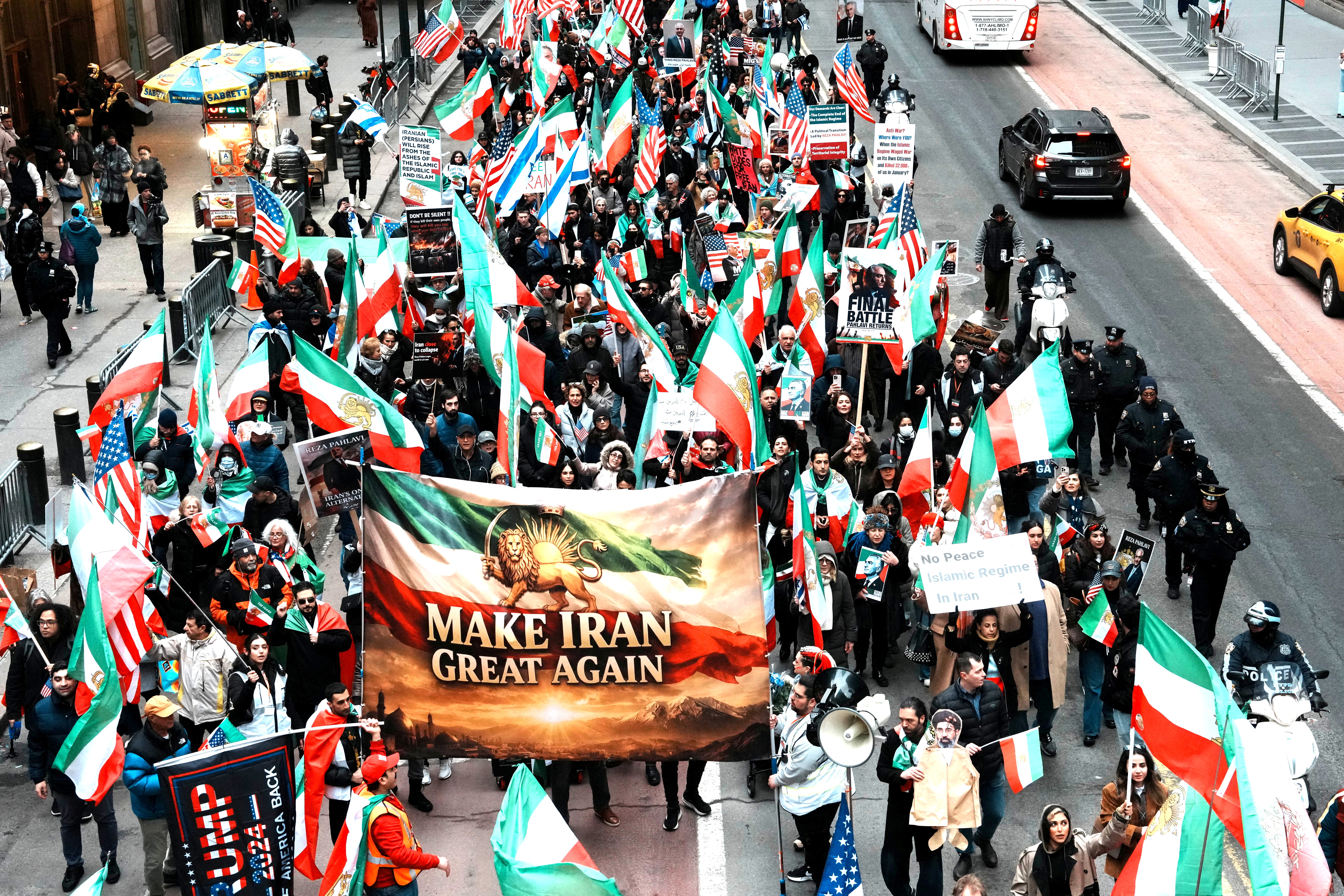 ▲ 3月15日,纽约曼哈顿当天举行针对伊朗政府的示威活动。示威者手持狮子太阳旗及标语在街头游行,并举起写有“Make Iran Great Again”的横幅,表达对伊朗政府的不满与抗议。示威活动在纽约市街道进行,现场聚集大量人群,警方在周边维持秩序。图为示威者在曼哈顿街头游行抗议伊朗政府。路透社