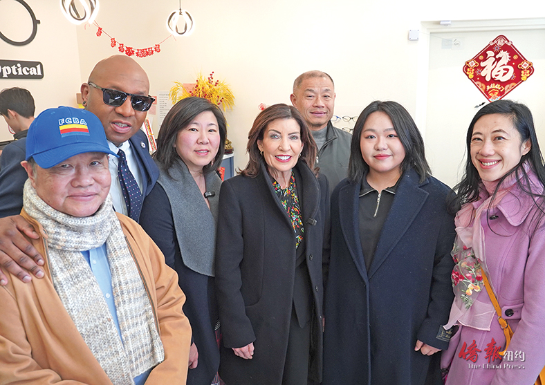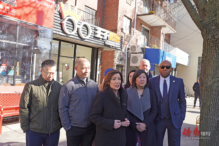 州长霍楚在多名民选官员和当地商界代表陪同下走访法拉盛。(州长办公室提供)