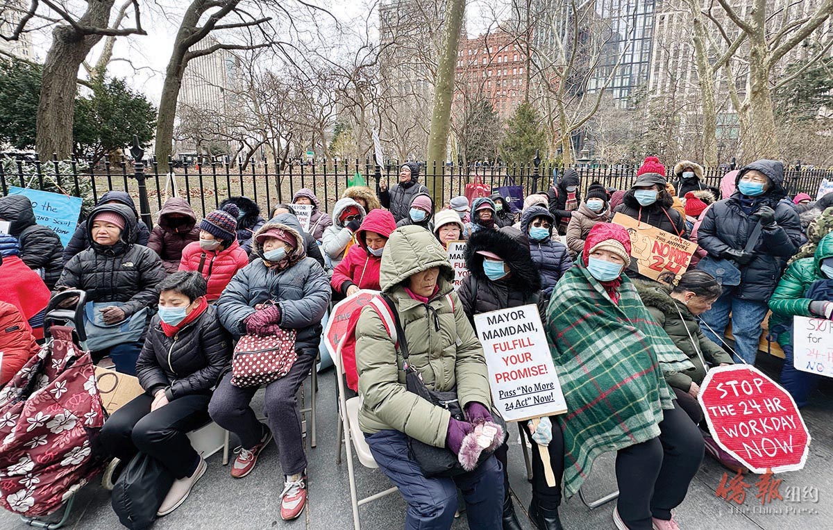【侨报记者韩清湲3月18日纽约报道】众多家庭护理员18日于市政厅外静坐抗议,要求市长曼达尼立即通过《结束24小时工作日法案》。