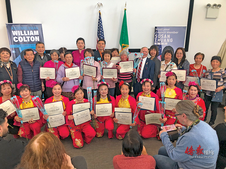 庄文怡和寇顿向多位华人社区服务中心成员颁奖。(高诗云摄)