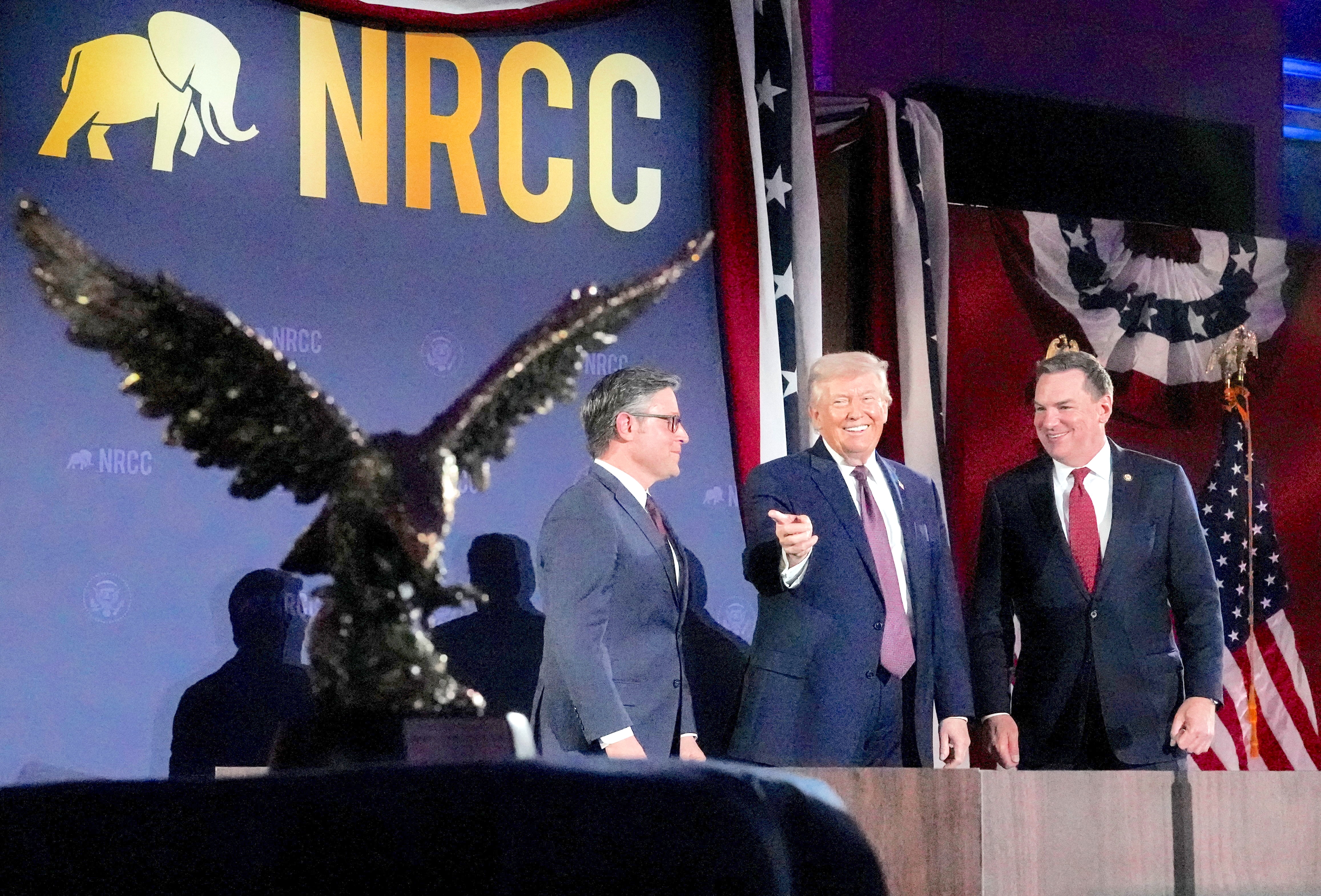 ▲ 3月25日,特朗普在华盛顿联合车站出席全国共和党国会委员会(NRCC)年度筹款晚宴并发表讲话,众议院议长约翰逊及NRCC主席哈德森一同出席。该活动为共和党年度最重要的筹资与动员平台之一,旨在为众议院选战筹集资金、整合竞选资源并巩固党内支持。当前共和党在中期选举形势中面临不利局面,部分关键选区竞争激烈、民调表现承压,党内借助高规格筹款活动强化资金与组织动员,以应对选举压力。 美联社