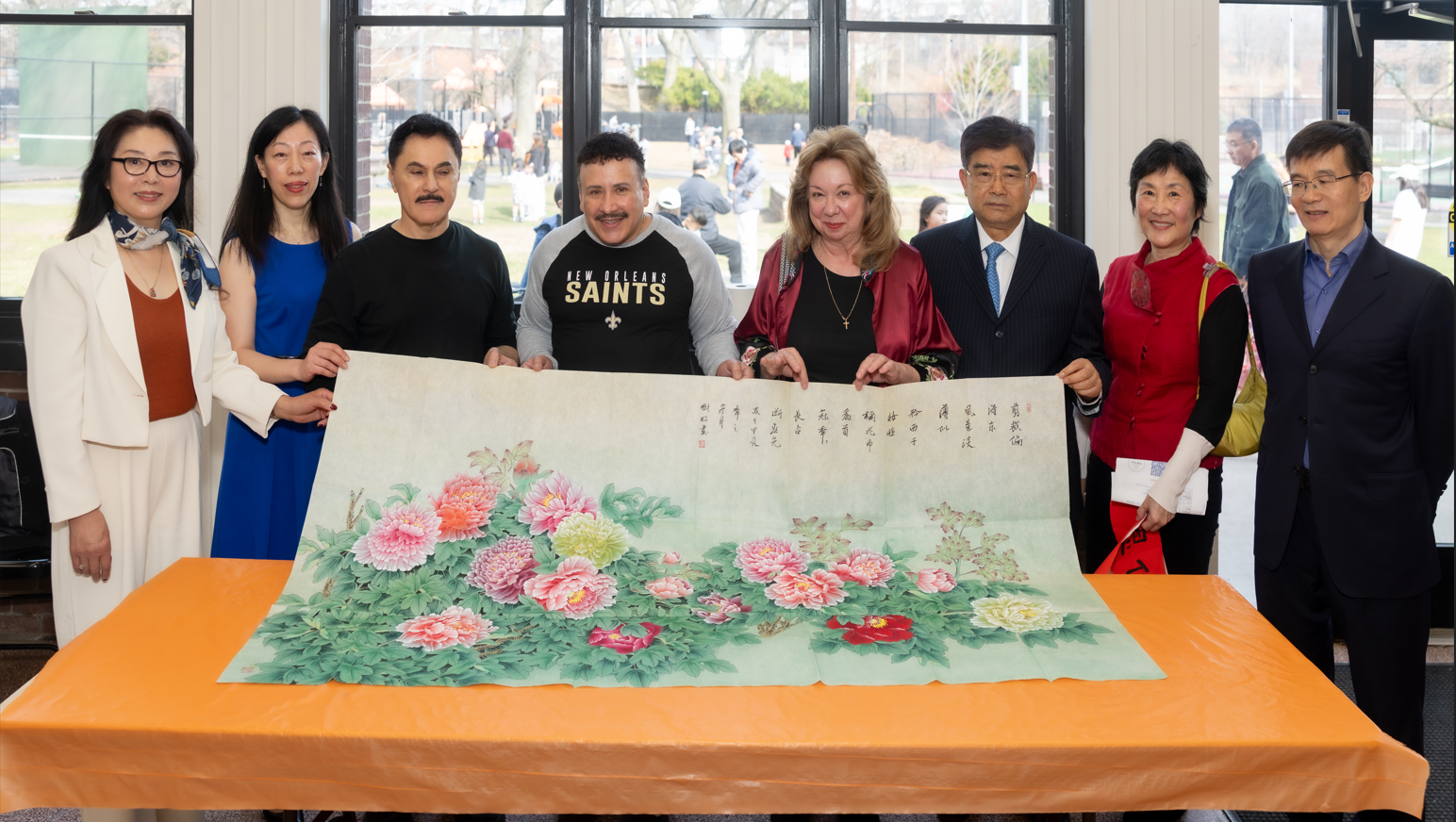 与会嘉宾在活动现场合影,左起:山东同乡会理事阎磊、美东菏泽同乡会副会长李亚军、美东菏泽同乡会理事长李进洪、李堡市议员 Paul Yoon、美国中国画学会副会长樊蕾、李堡市议员Ila Kasofsky 、郡长代表,亚裔咨询委员会主任 Ludi Hughes、中国驻纽约总领事馆领事向裕韬、中国驻纽约总领事馆领事荣顶、新泽西山东同乡会会长张黎、新泽西李堡华联主席侯平安、Englewood Cliffs 市议员梁智、山东省政府驻美洲经贸代表处首席代表石启东,新泽西山东同乡会名誉会长王成文。