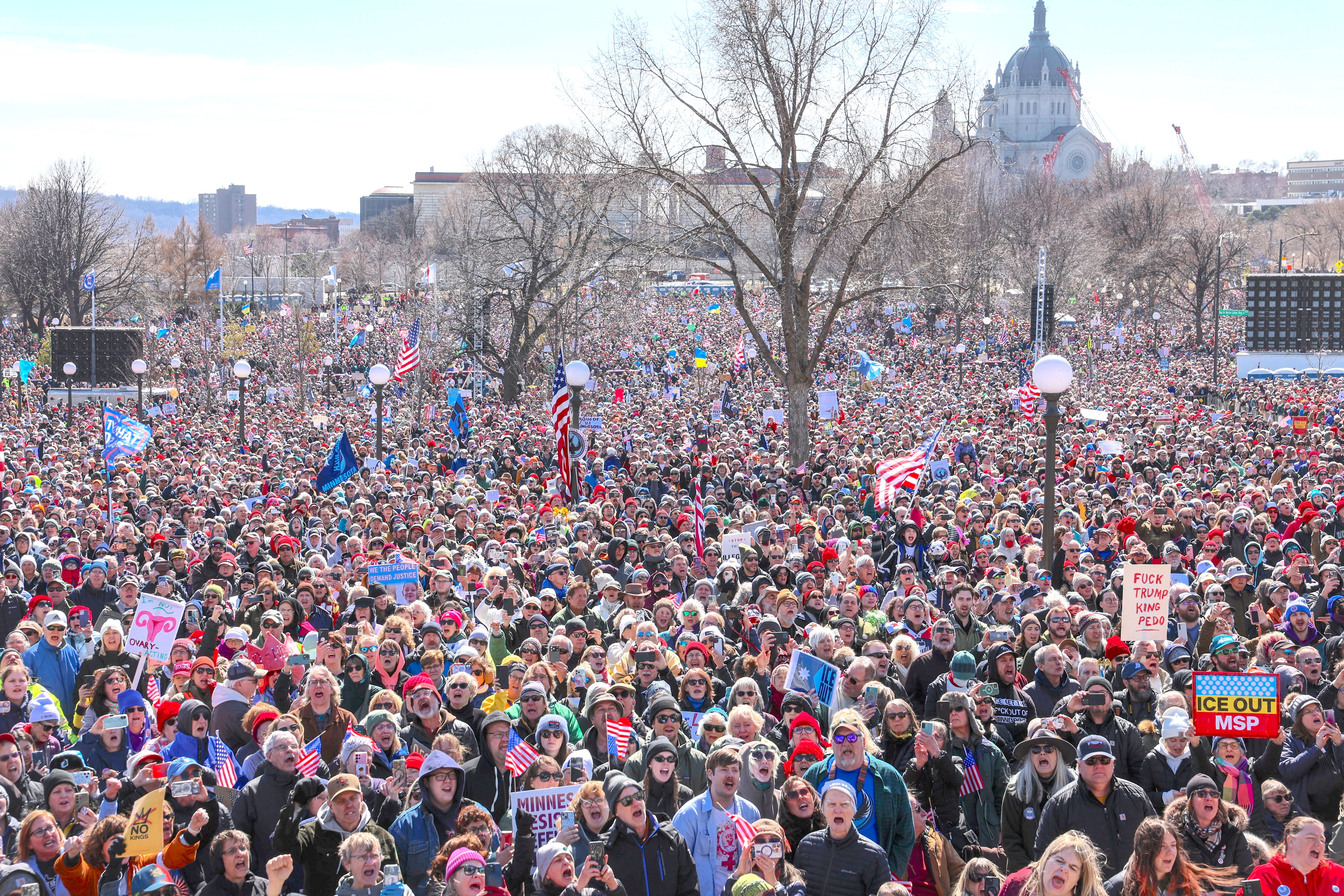 在纽约市,示威队伍绵延超过10个街区,警方估计参与人数达数万人;华盛顿国家广场聚集大批人群,高呼口号并举牌抗议;明尼苏达州圣保罗州议会草坪举行大型集会,成为中西部核心活动之一。达拉斯有数千人参加,并一度与反对示威人群发生对峙,警方随后实施拘捕。