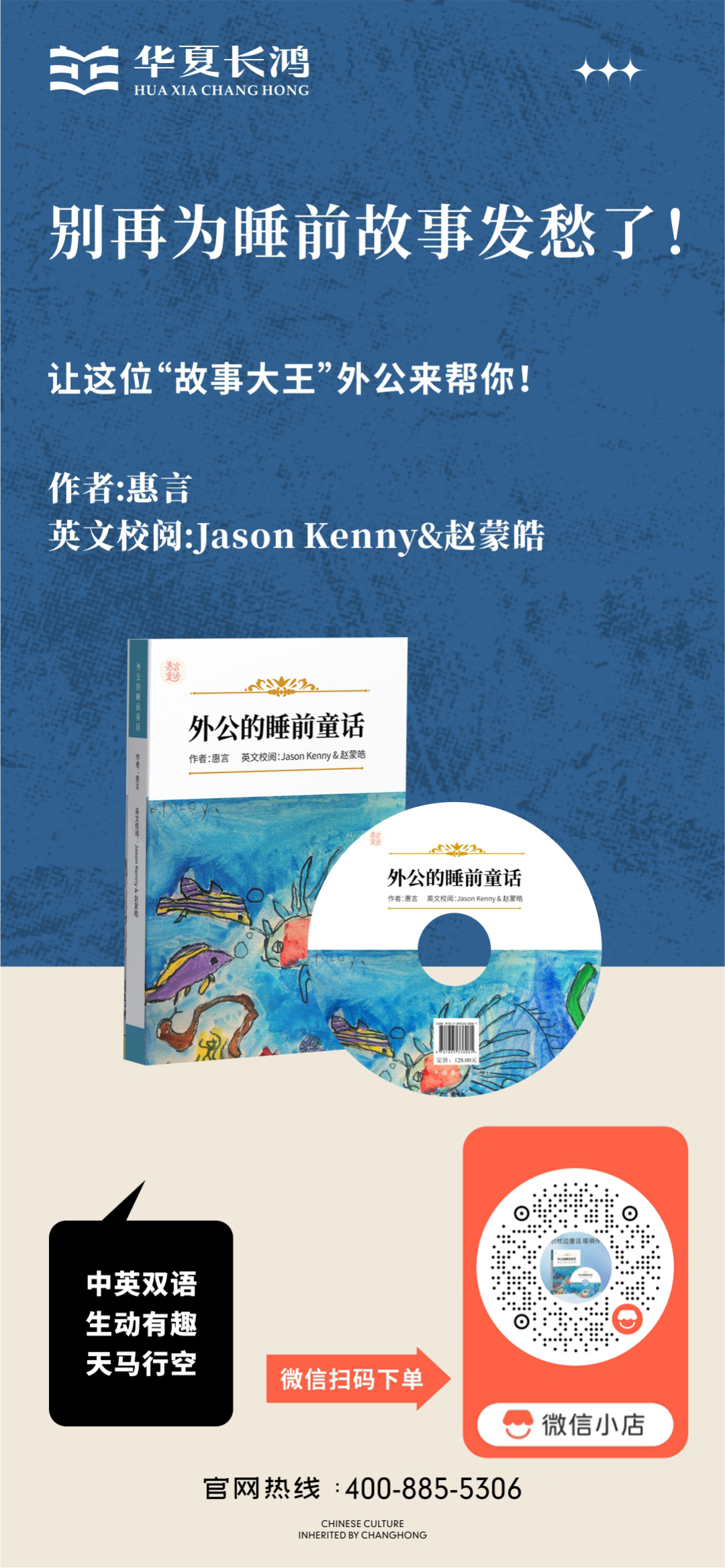 惠言先生60年代毕业于清华大学,1991年出国留学,1995年海归回到上海创业,2008年退休回到美国,定居新泽西。《外公的睡前童话》的创作,缘起与为外孙阿灵讲故事。每天晚上,睡前讲故事,成为外公和外孙的“必修课”。外孙觉得,外公能讲比书上好听的故事,就常常用中英文命题,要外公按照他出的题目,讲书上没有的故事。外孙的题目出得离奇随意,但大多与动物相关。恰好外公在清华的专业是环境保护和水处理,业余时间里又喜欢看《动物世界》《人和自然》之类的影视作品,外孙命题其实正对外公胃口。再加上小时候爱听评书,学了一点口技,于是接受外孙的挑战,即兴发挥,添油加醋,讲出的动物故事生动有趣,情节出人意料,又合乎情理。其中有:善于学习的聪明乌鸦与狐狸斗智;鲸鱼带小海豚外出旅游遇险;海豚在游泳比赛中智胜鲨鱼;小猫捕猎求猫头鹰帮忙;老虎和熊猫进行生死比武;利用保护色的蝴蝶与小猫躲猫猫;灵鸽为保护森林环境与老虎交友,等等。故事内容蕴含中华传统美德,充满爱心和智慧,富含日常生活知识,孩子非常爱听,听的很认真,喜怒哀乐的情绪会随着故事情节而波动。听完后心满意足,翻身安然入睡。