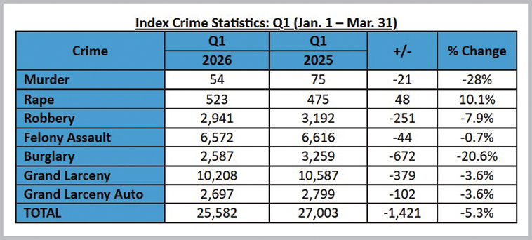 警方公布,一至三月纽约市主要类别犯罪率总体继续下降,全市下降5.3%(25582起比27003起),较2025年减少1421起。五大区主要犯罪均呈下降趋势,其中布朗士降幅最大,下降9.4%,减少650起案件。