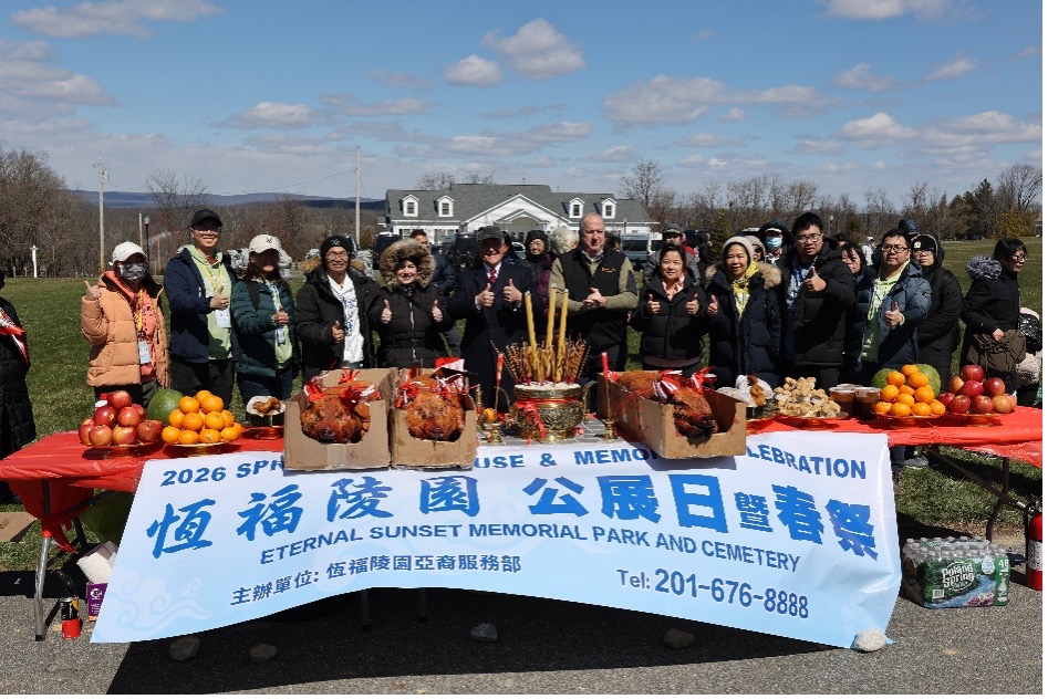 【纽约讯】马年呈祥,清明踏青。恒福陵园公展日暨2026年春祭活动,已于3月28日在新泽西州老佛爷镇高山之上的恒福陵园圆满举办。传承清明扫墓文化,重在倡导慎终追远。在众多的社区民众的共同参与和见証下,举行了传统的清明祭祖仪式,缅怀先人,向先贤致敬,表达思念。出席当天活动的嘉宾有恒福陵园创办人Buzzy先生、恒福陵园管理团队、亚裔服务团队等,及众多前来参观恒福陵园挑选福地的华人家庭社区侨胞。AM1480电台DJ们现场报道传统的祭祖文化,讲解九龙龟,万福牌坊,狮王狮群阵,2米多高的汉白玉地藏王菩萨凋像等众多中华传统文化特色的建筑地标。当日已经有不少的民众选购恒福陵园福地,作为亲人和家族成员永久安息的风水宝地,添福又添寿。恒福陵园持证华语经纪们,现场细心介绍恒福特色和福地情况,让前来参访的民众深入了解恒福陵园的独特设计与优质服务。