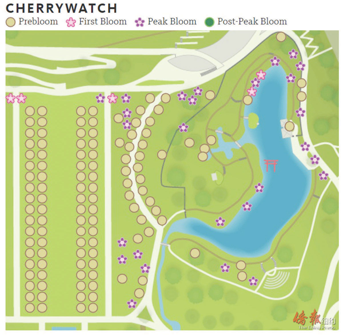 布碌仑植物园4月5日报告的樱花开放情况。(BBG)
