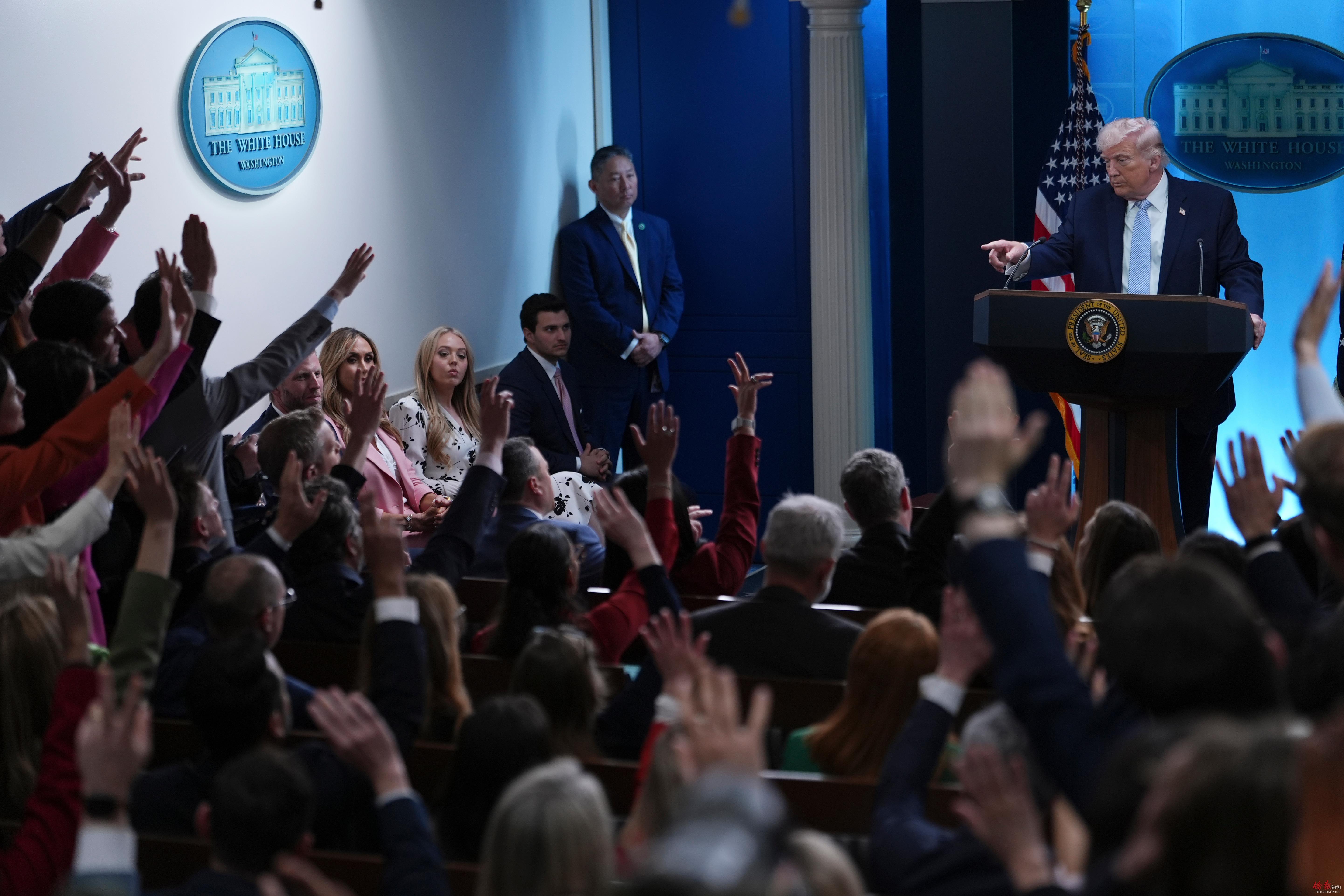▲4月6日,美国总统特朗普在白宫举行新闻发布会。图为特朗普与记者互动。 美联社