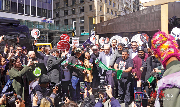 【侨报记者韩清湲4月7日纽约报道】市长曼达尼联合联邦参议员舒默(Chuck Schumer)及工人正义项目组织(Worker's Justice Project)7日(星期二)为坐落在市政厅公园的全市首个外卖郎休息站和电单车充电中心揭幕,旨在为全市8万名外卖郎提供综合服务。