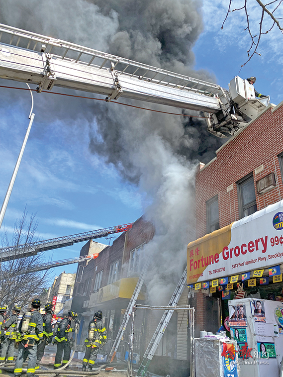 【侨报记者崔国萁4月12日纽约报道】位于布碌仑区公园(Borough Park)紧邻八大道的汉密尔顿堡公园大道(Fort Hamilton Pky)上的一家华人仓库,在12日(周日)下午突发三级火灾,令这栋两层建筑被烧毁,且还殃及相邻的两家店。有一位华裔目击者怀疑火灾可能与一名非裔男子有关,但市消防局对该起火灾的肇因仍在调查中。