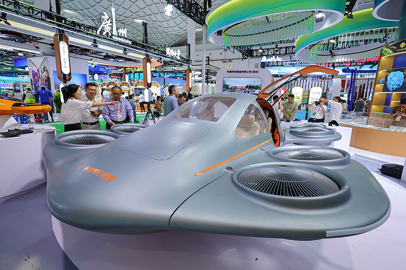 ▲全球首创“飞碟式”无人飞车EFC1200亮相第六届消博会现场。中新社