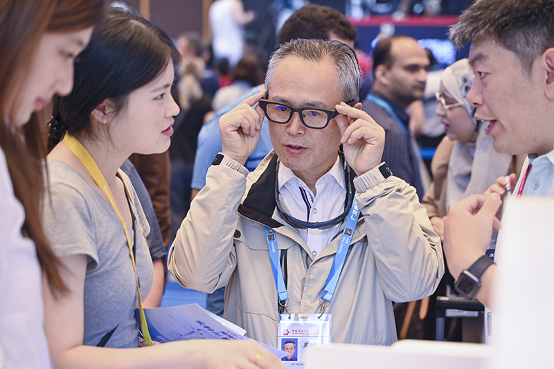 ▲境外采购商体验一款AI翻译眼镜。中新社