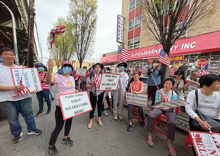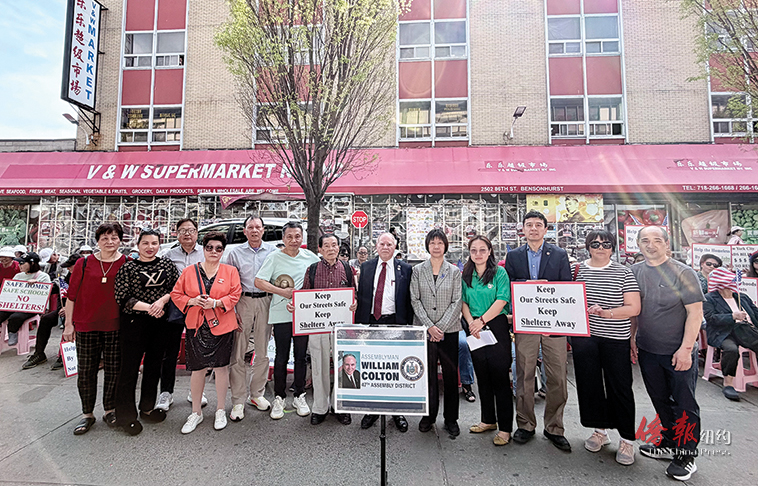 寇顿和庄文怡办公室15日在86街游民所抗议现场举行记者会。(崔国萁摄)