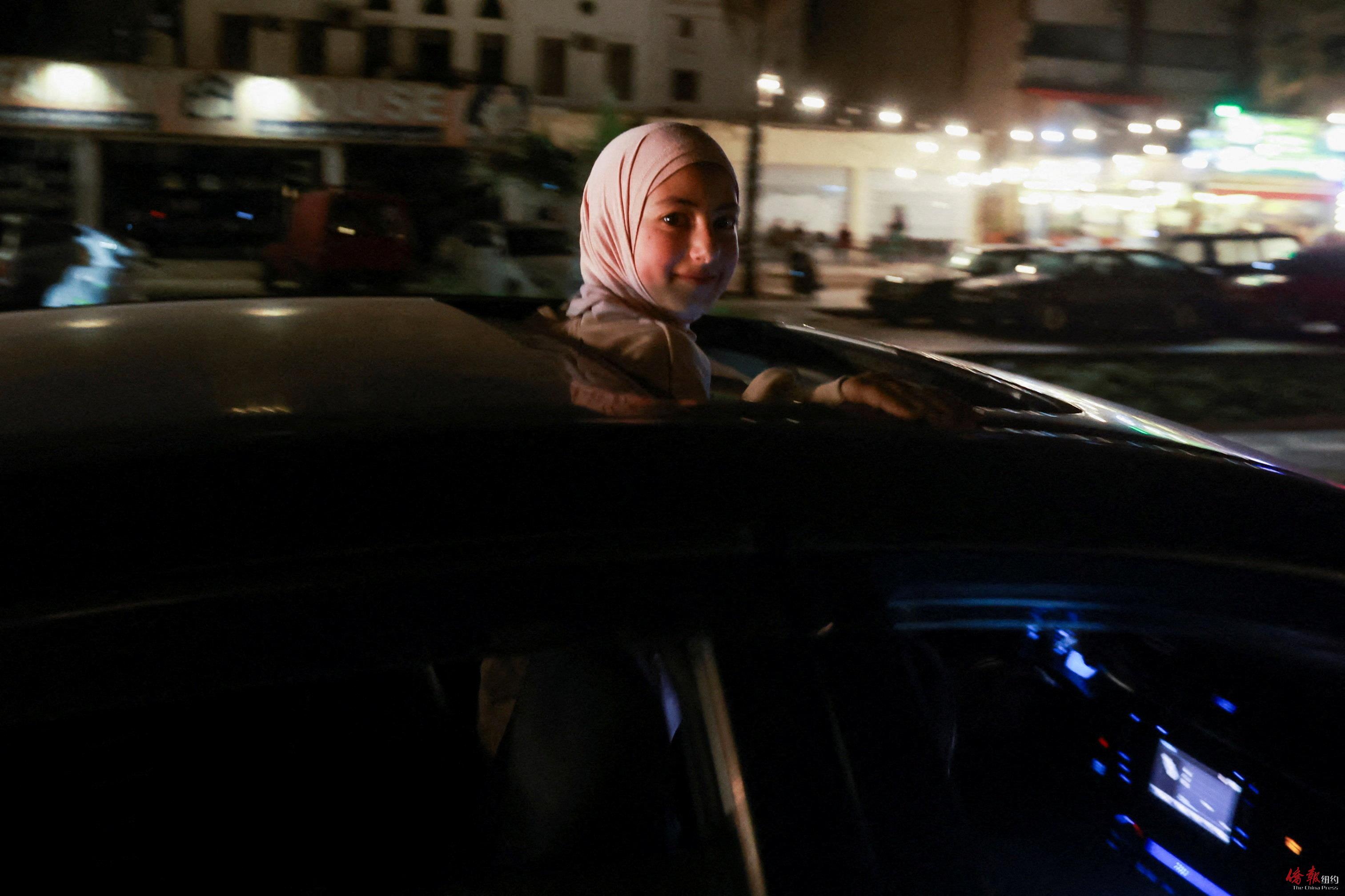 ▲当地时间17日零时黎以停火生效 。图为黎巴嫩南部城市西顿,一个女孩在车里兴奋之情溢于言表。路透社