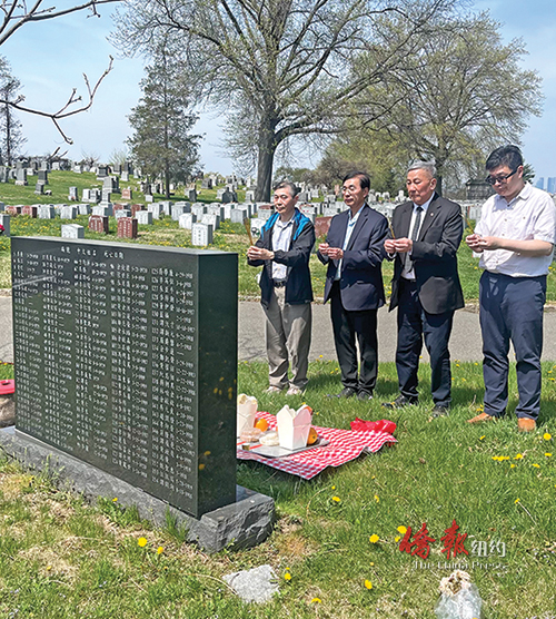 【侨报记者韩清湲4月16日纽约报道】中华公所16日(周四)举行一年一度的清明扫墓活动,中华公所主席伍锐贤、台山宁阳会馆主席伍坚石、美东联成公所秘书刘义斌,以及中华公所大楼管理员郭志光等带备三牲、果品、醴酒、糕点、纸钱等,集体踏青远足分布于史坦顿岛的银湖墓园、布碌仑的长青及柏山墓园等十一处先人墓地,虔诚拜祭,向先人表慎终追远之意。