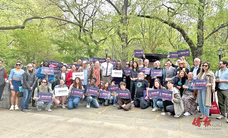 【侨报记者韩清湲4月19日纽约报道】正在竞选27选区州参议员的州众议员李荣恩(Grace Lee)日前18日于下东城苏域柏公园(Seward Park)外举行竞选集会,包括现任州参议员卡范纳(Brian Kavanagh)、市议员马泰(Christopher Marte)与高步尔(Gale Brewer)多位民选官员及数十位民众出席支持。