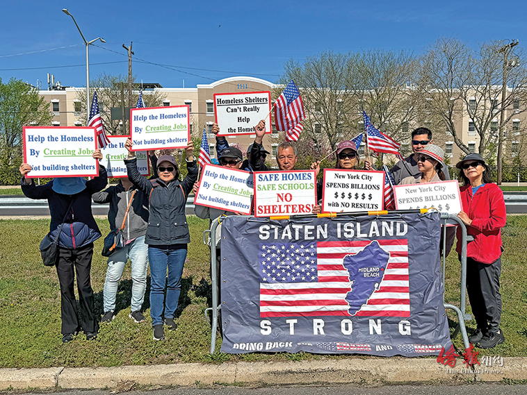 这是两周来史岛举行的第二场抗议市府游民所计划的集会。之前在4月5日,当地民代还率众于史岛南滩(South Shore)举行了大规模示威活动,反对市府在一块空地上兴建一间专门安置男性无家可归者的游民所计划,并誓言将抗争到底。