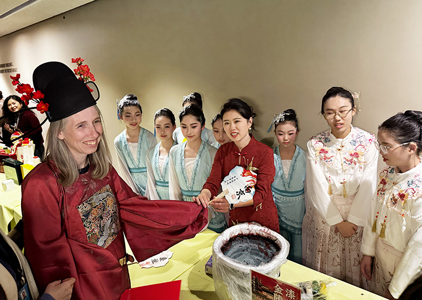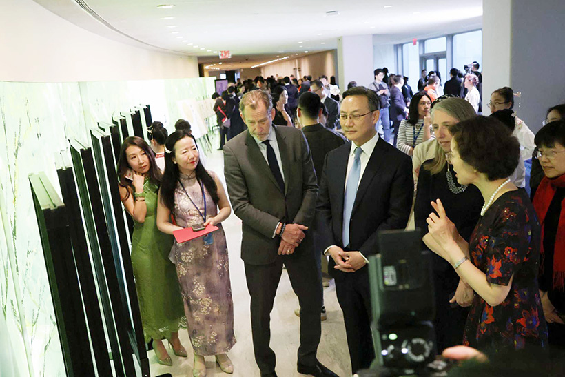 此外,庆祝晚会上还安排了精彩的文艺表演。联合国中文语言教学组带领来自不同国家正积极学习中文的联合国同事们动情吟诵了《谷雨春烟》唐诗三首,展示中华节气文化的深厚底蕴与东方美学的优雅意境。小银星艺术团的新国风舞蹈《踏春》则以春日游园为灵感,舞者们轻盈灵动,舒展翩跹,赋予千年国风新的时代气息。艺术团成员还以独特的青少年视角,与南京中国科举博物馆馆员一起讲述了秦淮河畔的古今故事,带领来宾领略“十里秦淮”的锦绣画卷。现场同步展示了剪纸、秦淮灯彩、金榜题名扇绘漂漆、活字印刷等传统非遗项目。