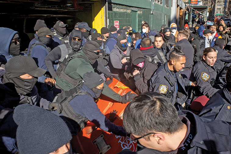警方在华埠街头应对阻止ICE抓捕行动的抗议者。(路透社资料图)