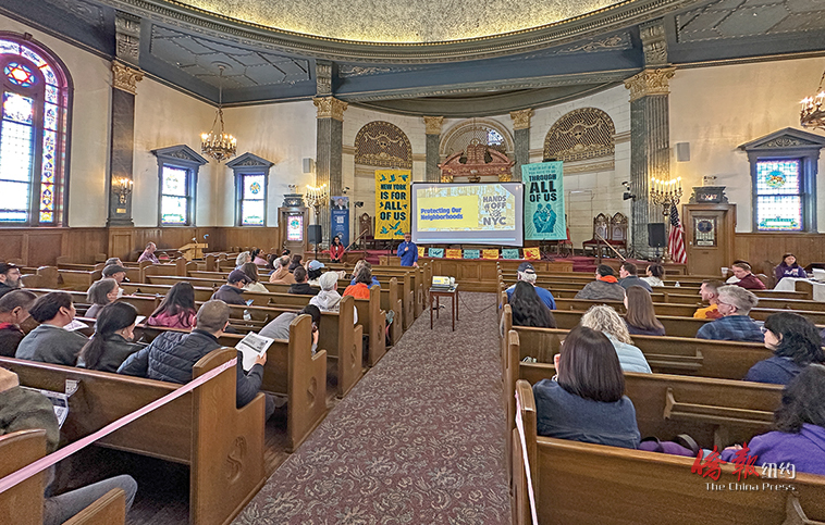 州参议员刘醇逸联合多个社区组织在法拉盛举行移民执法与权益维护讲座。(韩清湲摄)