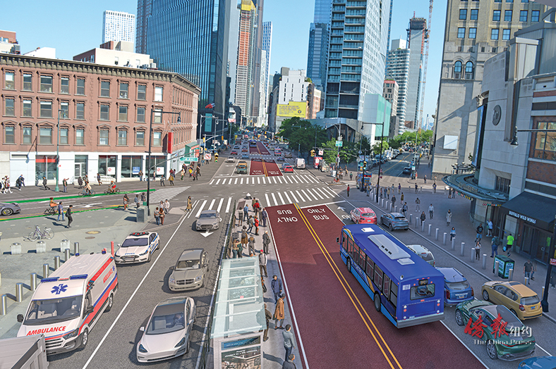 同时,该大道改造项目还将包含多项具体措施:设立专用的货物装卸区,实施一系列安全设施升级,并通过在路口处设置混凝土材质的公交候车岛以及绘制路缘延伸线等,为行人新增总计29000平方英尺的步行空间。