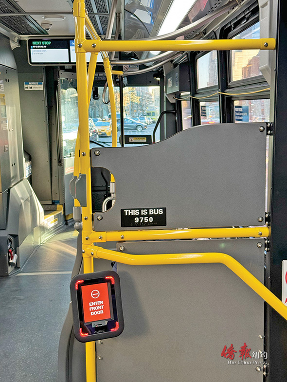 为防止逃票,巴士上后门位置的OMNY收费设备大多被禁用。(管黎明摄)